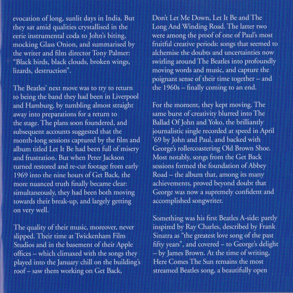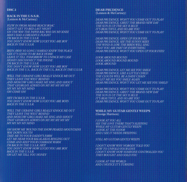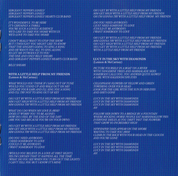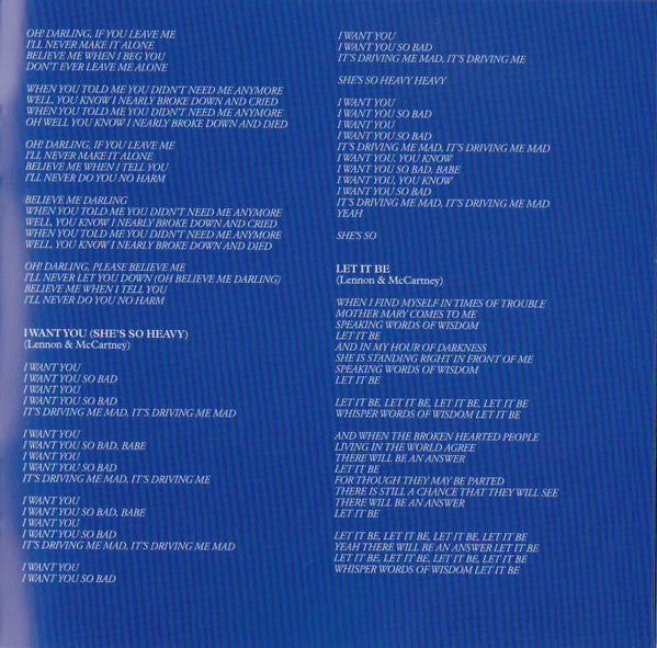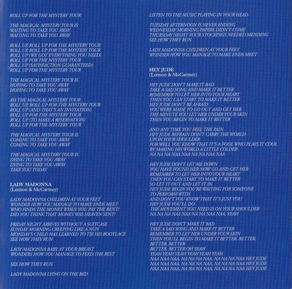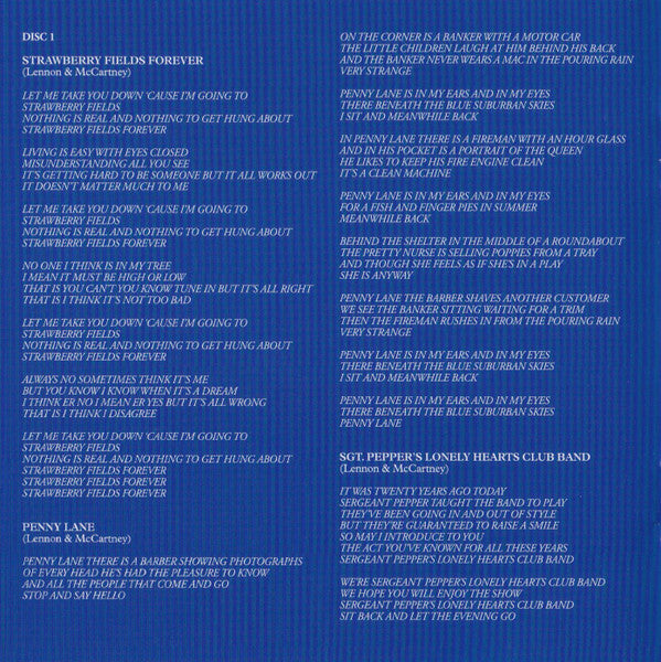Glass Master contains CD Text. CD Text contains artist ("The Beatles"), album title ("1967 1970 [Blue Album/CD1]", the '-' character omitted between the years; "1967-1970 [Blue Album/CD2]") and song titles.