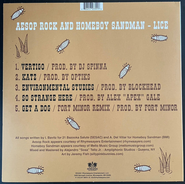 Initially released in 2015 as a free direct download, followed by an extremely limited vinyl pressing sold exclusively on tour, Aesop Rock and Homeboy Sandman's Lice is finally available to fans everywhere. The first in a series of EP releases, Lice featured production from DJ Spinna, Optiks, Blockhead, Alex "Apex" Gale and Mike Shinoda. The original cover art was designed by renowned illustrator Jeremy Fish.