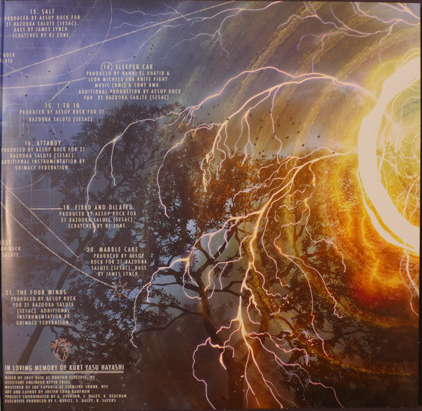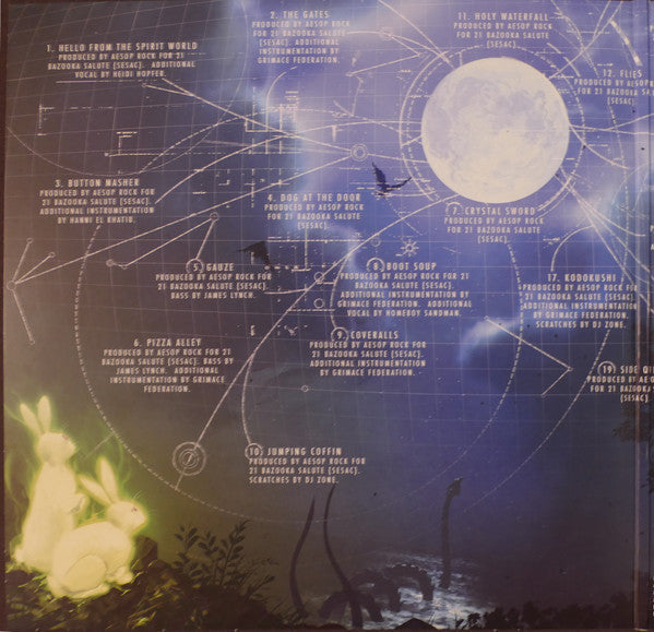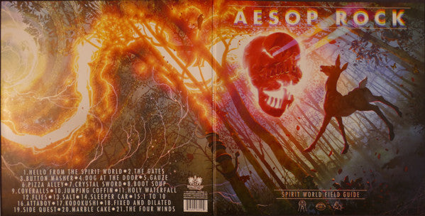 Those are the words of the album's narrator - an attempt to prepare listeners, both old and new, for a safe entry into the Spirit World. It's been a long road for Aesop Rock to get here, releasing a steady stream of impressive albums, singles, and collaborative projects that have continued to invigorate, solidify and grow his diverse fan base, but he shows no signs of slowing down or deviating from his path, constantly pushing his creative limits. Last year saw the release of Malibu Ken, a joint effort featuring the psychedelic and trippy sounds of producer Tobacco, providing a different type of intrigue for Aesop's descriptive, compelling, and often humorous, writing. Then, he kicked 2020 off with a hard-driving single, "Rogue Wave", followed not long after by Freedom Finger, which found Aesop immersing himself in the video game world that the music was written and produced for. And this year still has a few exciting releases on the horizon yet, including the infinite heroics of "Long-Legged Larry", a 20-year anniversary vinyl release of his debut album, Float, and now his brand new album, Spirit World Field Guide. Since his debut in the late nineties, Aesop Rock's writing has been of the highest caliber, but one thing that has continually evolved is his near-flawless and diverse flow, now perfectly infused with his personality and a gift for visual imagery. On Spirit World Field Guide, characters, inanimate objects, and their surrounding environments vividly come to life as Aesop describes each passing moment throughout the album's twenty-one chapters. Welcome to the Spirit World. Explore with intention.