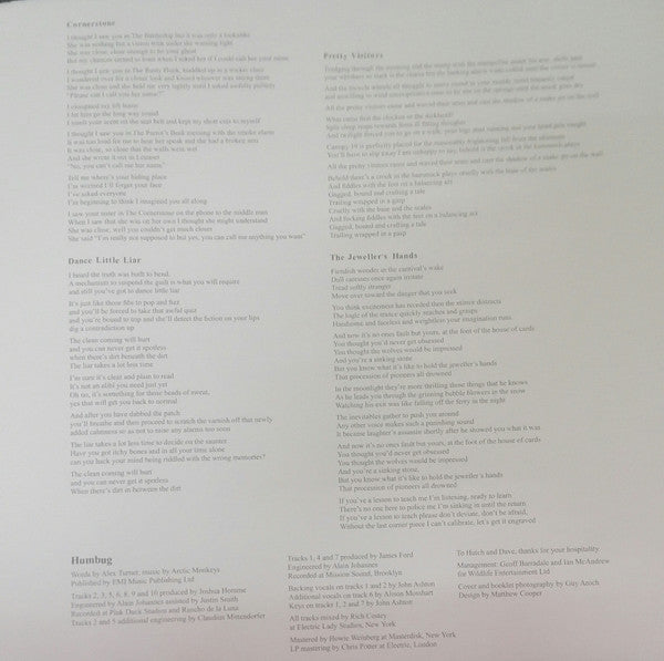 2009 release, the third album from Sheffield's Arctic Monkeys. Humbug finds the band brimming with vim, vigor and new ideas. They brought in a new production accomplice, Josh Homme (Queens of the Stone Age), for some of the recording. He generously hosted and produced tracks with them at his Joshua Tree studio. Then they rejoined forces with James Ford (Simian Mobile Disco), producer of the previous two Arctic Monkeys and Last Shadow Puppets albums, in Brooklyn, NY to complete the tracks that became Humbug. The album is a stunning set of songs both heavier and lush than previous albums but still full of the Monkeys usual punch and vitality.