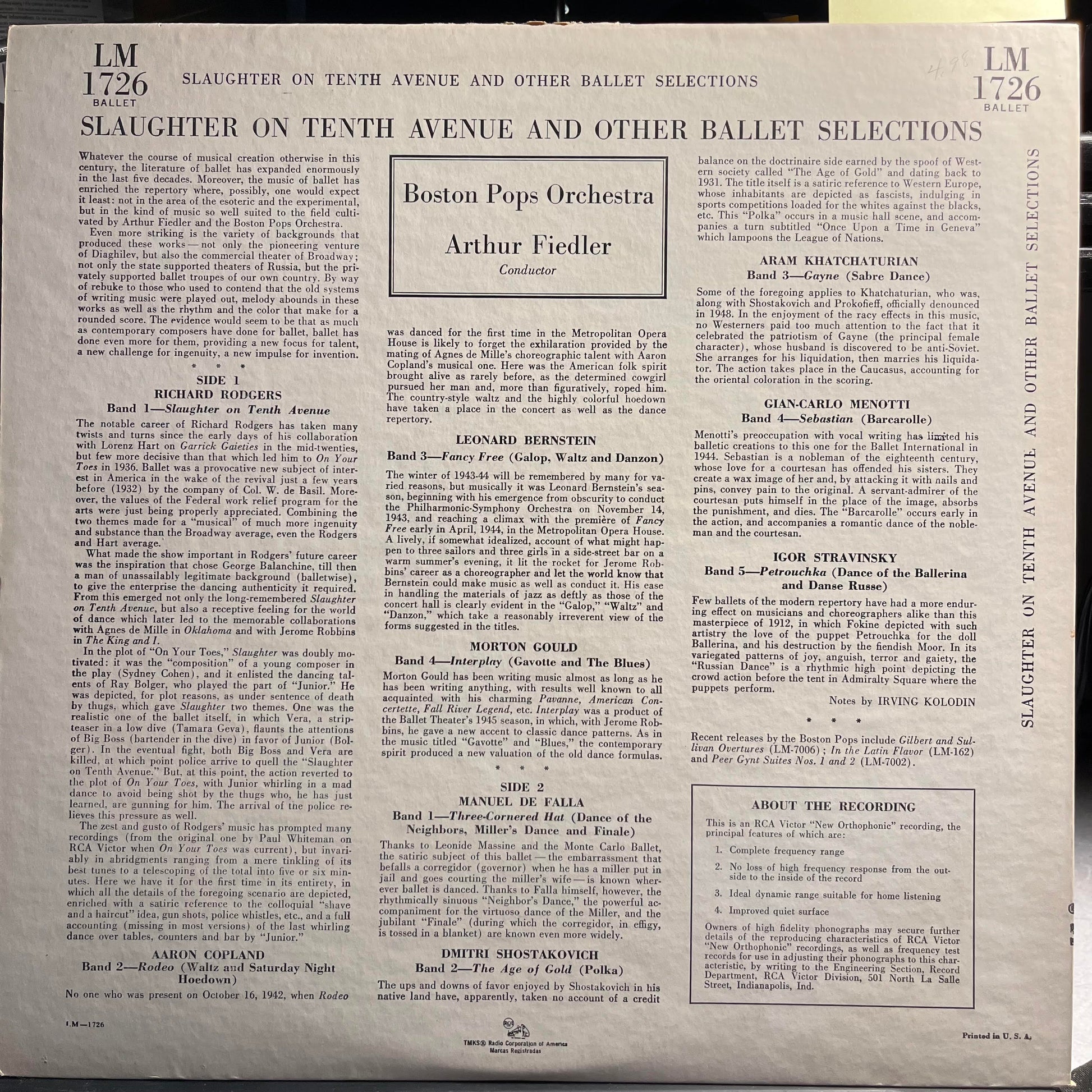 Tracklist: A1. Slaughter On Tenth Avenue, A2.1. Waltz, A2.2. Saturday Night Hoedown, . Three Dances From Fancy Free, A3.1. Galop, A3.2. Waltz, A3.3. Danzon, . -, A4.1. Gavotte, A4.2. The Blues, B1. The Three Cornered Hat, Ballet Suite, B2. Polka (From "The Age Of Gold" Ballet), B3. Sabre Dance (From "Gayne" Ballet Suite), B4. Barcarolle (From "Sebastian"), . Excerpts From "Pretrouchka", B5.1. Dance Of The Ballerina, B5.2. Danse Russe