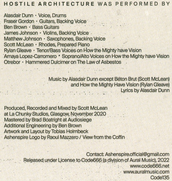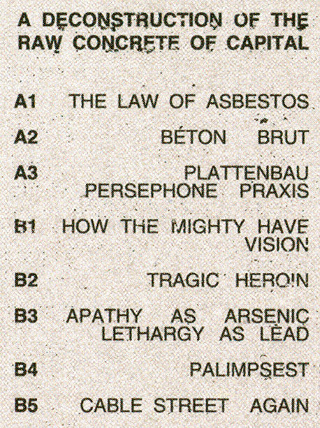 Tracklist: A1. The Law Of Asbestos, A2. Béton Brut, A3. Plattenbau Persephone Praxis, B1. How The Mighty Have Vision, B2. Tragic Heroin, B3. Apathy As Arsenic Lethargy As Lead, B4. Palimpsest, B5. Cable Street Again