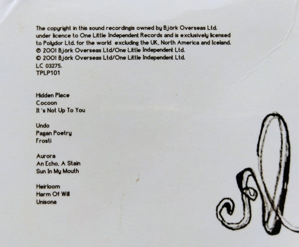 Tracklist: A1. Hidden Place, A2. Cocoon, A3. It's Not Up To You, B1. Undo, B2. Pagan Poetry, B3. Frosti, C1. Aurora, C2. An Echo, A Stain, C3. Sun In My Mouth, D1. Heirloom, D2. Harm Of Will, D3. Unison