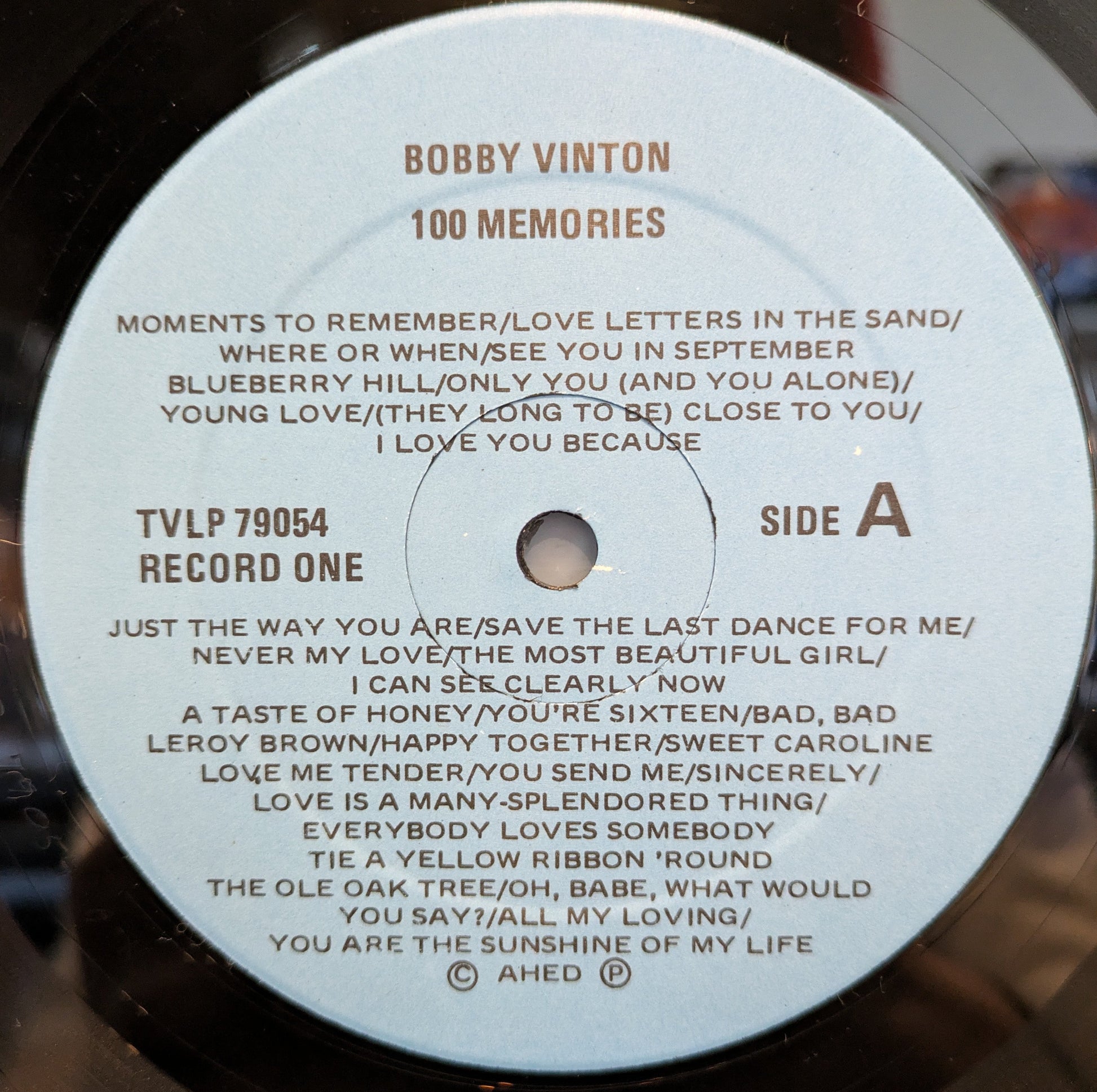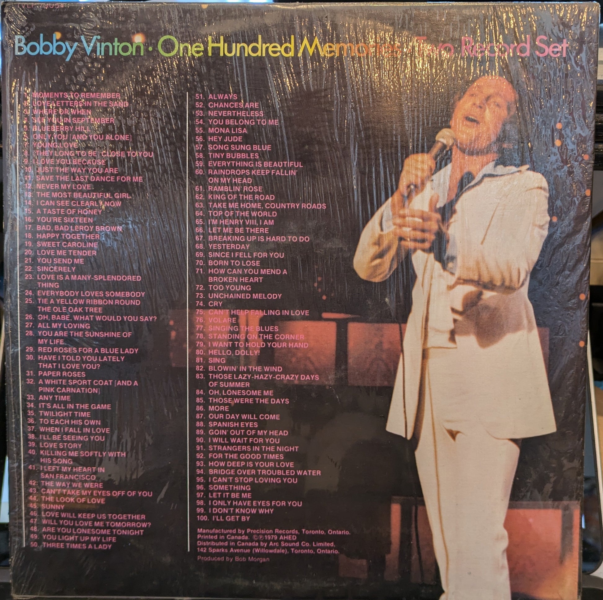 Bobby Vinton covers 100 songs across genres in medley format. There are 6 tracks on side A, 5 tracks on B,C & D. There are up to 5 songs on 1 track.