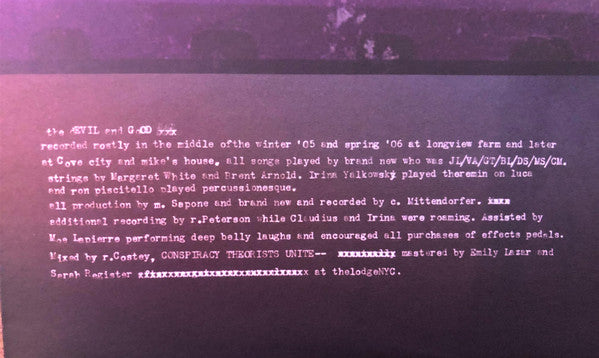 Double vinyl LP pressing. The Devil and God Are Raging Inside Me is the third studio album by Brand New. It was recorded from 2005 to 2006 in studios in Long Island and Massachusetts with producer Mike Sapone, and released on November 21, 2006 through Interscope Records, making it their major label debut. Two singles from the album were released: "Sowing Season" and "Jesus Christ". The album peaked at #31 on the Billboard 200, becoming the band's highest-charting record at the time of it's release.