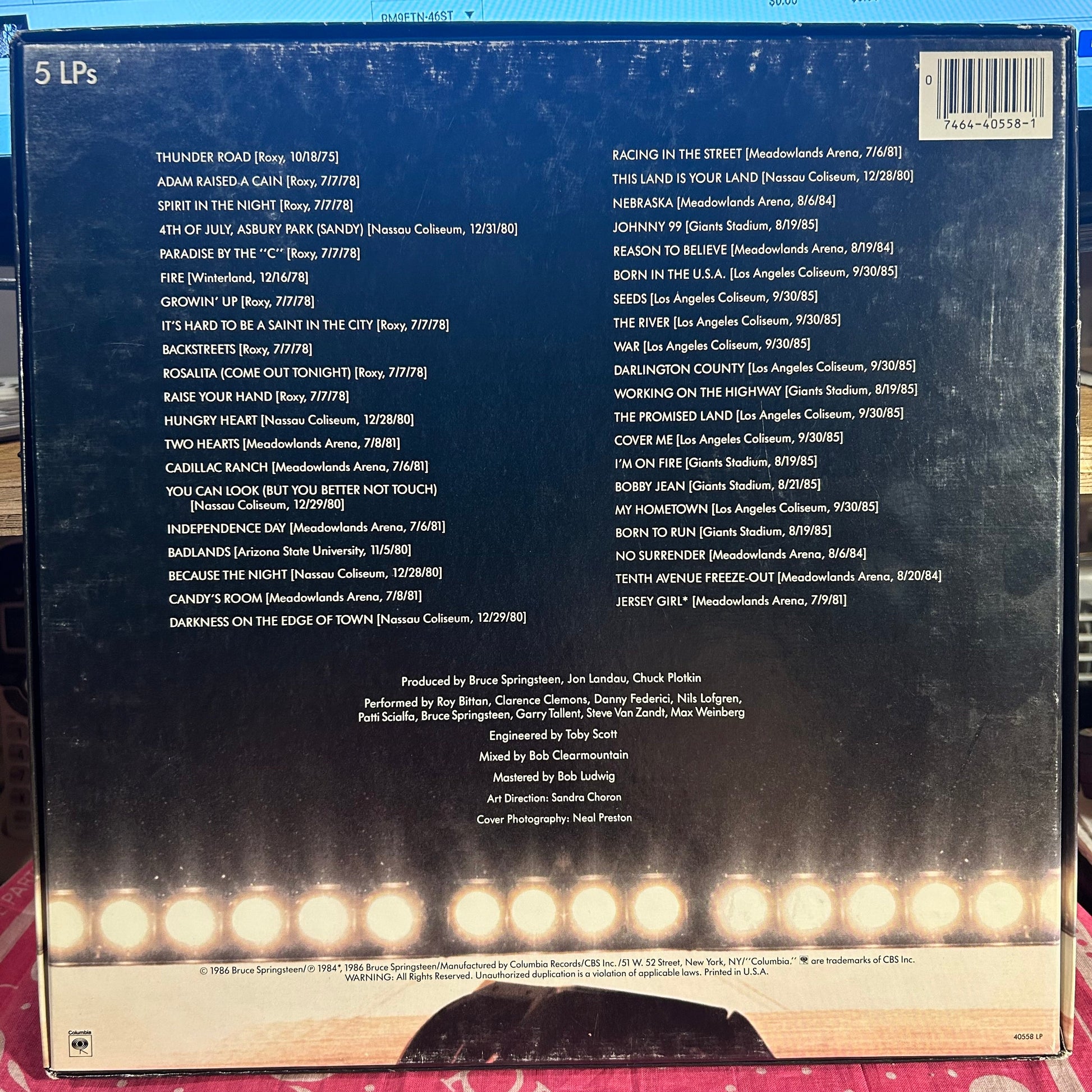 Tracklist: A1. Thunder Road, A2. Adam Raised A Cain, A3. Spirit In The Night, A4. 4th Of July, Asbury Park (Sandy), B1. Paradise By The "C", B2. Fire, B3. Growin' Up, B4. It's Hard To Be A Saint In The City, C1. Backstreets, C2. Rosalita (Come Out Tonight), C3. Raise Your Hand, D1. Hungry Heart, D2. Two Hearts, D3. Cadillac Ranch, D4. You Can Look (But You Better Not Touch), D5. Independence Day, E1. Badlands, E2. Because The Night, E3. Candy's Room, E4. Darkness On The Edge Of Town, E5. Racing In The Street, F1. This Land Is Your Land, F2. Nebraska, F3. Johnny 99, F4. Reason To Believe, G1. Born In The U.S.A., G2. Seeds, G3. The River, H1. War, H2. Darlington County, H3. Working On The Highway, H4. The Promised Land, I1. Cover Me, I2. I'm On Fire, I3. Bobby Jean, I4. My Hometown, J1. Born To Run, J2. No Surrender, J3. Tenth Avenue Freeze-Out, J4. Jersey Girl