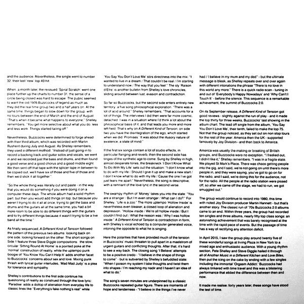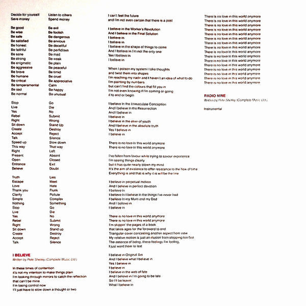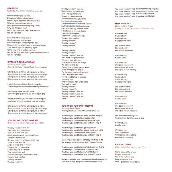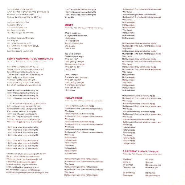Tracklist: A1. Paradise, A2. Sitting Around At Home, A3. You Say You Don't Love Me, A4. You Know You Can't Help It, A5. Mad Mad Judy, A6. Raison D' Etre, B1. I Don't Know What I Want To Do With My Life, B2. Money, B3. Hollow Inside, B4. A Different Kind Of Tension, B5. I Believe, B6. Radio Nine