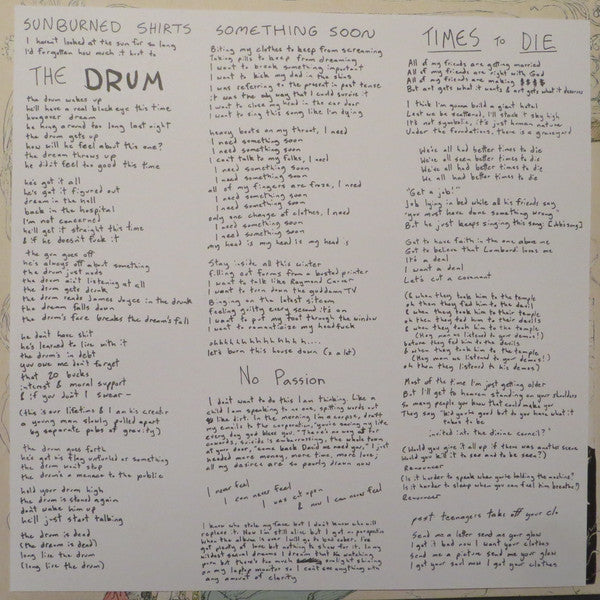 Tracklist: A1. Sunburned Shirts, A2. The Drum, A3. Something Soon, A4. No Passion, A5. Times To Die, A6. Psst, Teenagers, Take Off Your Clo, B1. Strangers, B2. Maud Gone, B3. Los Borrachos (I Don't Have Any Hope Left, But The Weather Is Nice), B4. Bad Role Models, Old Idols Exhumed (Psst, Teenagers, Put Your Clothes Back O), B5. Oh! Starving