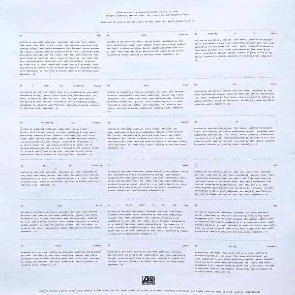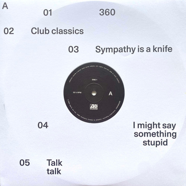 Tracklist: A1. 360, A2. Club Classics, A3. Sympathy Is A Knife, A4. I Might Say Something Stupid, A5. Talk Talk, B1. Von Dutch, B2. Everything Is Romantic, B3. Rewind, B4. So I, B5. Girl, So Confusing, C1. Apple, C2. B2b, C3. Mean Girls, C4. I Think About It All The Time, C5. 365, D1. Hello Goodbye, D2. Guess, D3. Spring Breakers