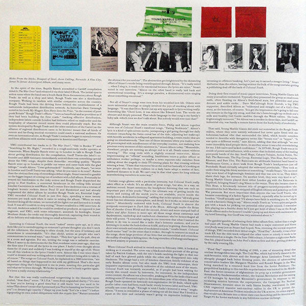 Tracklist: A1. Searching For Mr Right, A2. Include Me Out, A3. The Taxi, A4. Eating Noddemix, A5. Constantly Changing, A6. N.I.T.A., A7. Colossal Youth, B1. Music For Evenings, B2. The Man Amplifier, B3. Choci Loni, B4. Wurlitzer Jukebox !, B5. Salad Days, B6. Credit In The Straight World, B7. Brand - New - Life, B8. Wind In The Rigging