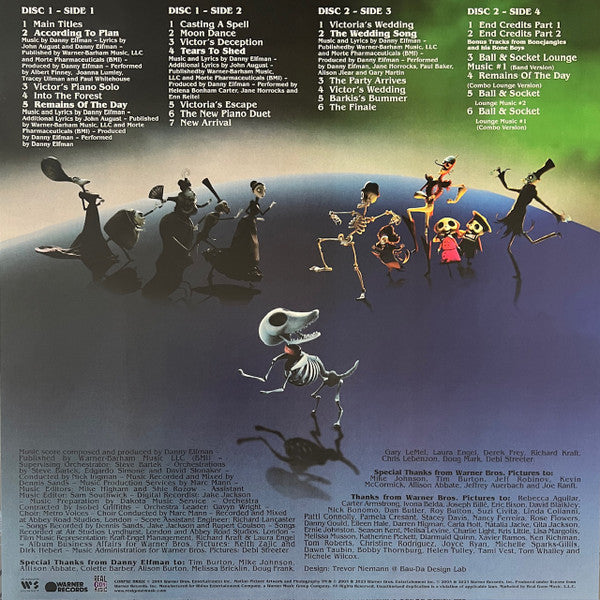 Tracklist: A1. Main Titles, A2. According To Plan, A3. Victor's Piano Solo, A4. Into The Forest, A5. Remains Of The Day, B1. Casting A Spell, B2. Moon Dance, B3. Victor's Deception, B4. Tears To Shed, B5. Victor's Escape, B6. The New Piano Duet, B7. New Arrival, C1. Victoria's Wedding, C2. The Wedding Song, C3. The Party Arrives, C4. Victor's Wedding, C5. Barkis's Bummer, C6. The Finale, D1. End Credits Part 1, D2. End Credits Part 2, . Bonus Tracks From Bonejangles And His Bone Boys, D3. Ball & Socket Lounge Music (Band Version), D4. Remains Of The Day (Combo Lounge Version), D5. Ball & Socket Lounge Music #2, D6. Ball & Socket Lounge Music #1 (Combo Version)