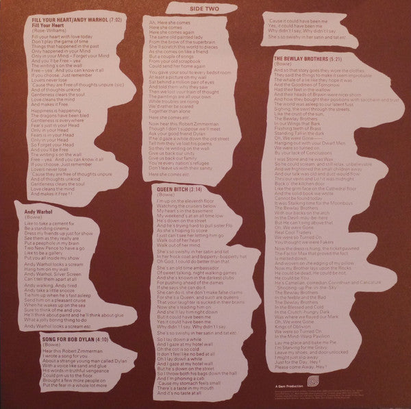 Tracklist: A1. Changes, . Oh! You Pretty Things/Eight Line Poem, A4. Life On Mars?, A5. Kooks, A6. Quicksand, . Fill Your Heart/Andy Warhol, B3. Song For Bob Dylan, B4. Queen Bitch, B5. The Bewlay Brothers