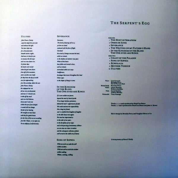 Tracklist: A1. The Host Of Seraphim, A2. Orbis De Ignis, A3. Severance, A4. The Writing On My Father's Hand, A5. In The Kingdom Of The Blind The One-Eyed Are Kings, B1. Chant Of The Paladin, B2. Song Of Sophia, B3. Echolalia, B4. Mother Tongue, B5. Ullyses