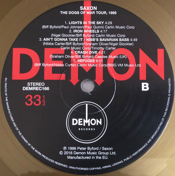 Tracklist: A1. Intro/Warlord, A2. Dogs Of War, A3. Forever Free, A4. Requiem (We Will Remember), A5. Crusader, B1. Lights In The Sky, B2. Iron Wheels, B3. Ain'T Gonna Take It / Nibb's Bavarian Bass, B4. Crash Dive, B5. Refugee, C1. Solid Ball Of Rock, C2. The Great White Buffalo, C3. The Eagle Has Landed / Paul Quinn Guitar Feature, C4. Princess Of The Night, D1. Can't Stop Rockin', D2. Denim And Leather / Doug Scarratt Guitar Feature, D3. Wheels Of Steel / Demolition Alley