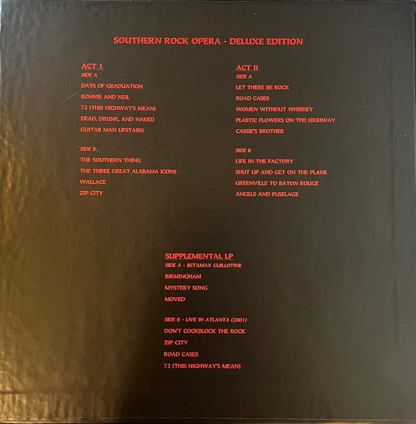 Act I, A1. Days Of Graduation, A2. Ronnie And Neil, A3. 72 (This Highway's Mean), A4. Dead, Drunk And Naked, A5. Guitar Man Upstairs, B1. The Southern Thing, B2. The Great Alabama Icons, B4. Wallace, B4. Zip City, . Act II, C1. Let There Be Rock, C2. Road Cases, C3. Women Without Whiskey, C4. Plastic Flowers On The Highway, C5. Cassie's Brother, D1. Life In The Factory, D2. Shut Up And Get On The Plane, D3. Greenville To Baton Rouge, D4. Angels And Fuselage, . Supplemental LP, . Betamax Guillotine, E1. Birmingham, E2. Mystery Song, E3. Moved, . Live In Atlanta (2001), F1. Don’t Cockblock The Rock, F2. Zip City, F3. Road Cases, F4. 72 (This Highway’s Mean)
