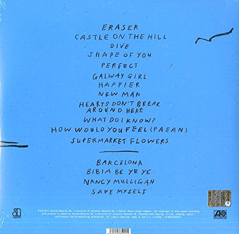 Tracklist: A1. Eraser , A2. Castle On The Hill, A3. Dive, A4. Shape Of You, B1. Perfect , B2. Galway Girl, B3. Happier, B4. New Man, C1. Hearts Don't Break Around Here, C2. What Do I Know?, C3. How Would You Feel (Paean), C4. Supermarket Flowers, D1. Barcelona , D2. Bibia Be Ye Ye, D3. Nancy Mulligan, D4. Save Myself