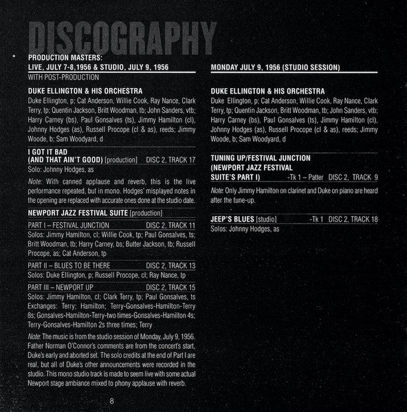 Drums – Sam Woodyard (tracks: 1-1, 1-3, 1-5, 1-7, 1-9, 1-11, 1-13, 1-15, 1-17, 1-19, 2-2, 2-3, 2-5, 2-7 to 2-9, 2-11, 2-13, 2-15, 2-17)