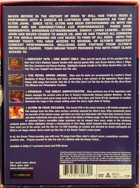 Tracklist: . New York City (Madison Square Garden): Greatest Hits - One Night Only, October 21st, 2000, 1-01. Funeral For A Friend (Love Lies Bleeding), 1-02. Candle In The Wind, 1-03. Bennie And The Jets, 1-04. Goodbye Yellow Brick Road, 1-05. Someone Saved My Life Tonight, 1-06. Little Jeannie, 1-07. Philadelphia Freedom, 1-08. Tiny Dancer, 1-09. Can You Feel The Love Tonight?, 1-10. Daniel, 1-11. Rocket Man, 1-12. Club At The End Of The Street, 1-13. Blue Eyes, 1-14. I Guess That's Why They Call It The Blues, 1-15. The One, 1-16. I Don't Wanna Go On With You Like That, 1-17. Sorry Seems To Be The Hardest Word, 1-18. Sacrifice, 1-19. Come Together, 1-20. Your Song, 1-21. Sad Songs (Say So Much), 1-22. I'm Still Standing, 1-23. Crocodile Rock, 1-24. Saturday Night's Alright For Fighting, 1-25. The Bitch Is Back, 1-26. Don't Let The Sun Go Down On me, 1-27. Don't Go Breaking My Heart, . London: The Royal Opera House, December 1st, 2000, 2-01. Rehearsals / Interviews, 2-02. Sixty Years On, 2-03. Take Me To The Pilot, 2-04. This Train Don't Stop There Anymore, 2-05. Carla Etude, 2-06. Tonight, 2-07. Sorry Seems To Be The Hardest Word, 2-08. Philadelphia Freedom, 2-09. Burn Down The Mission, 2-10. Don't Let The Sun Go Down On Me, 2-11. Your Song, 2-12. Saturday Night's Alright For Fighting, . Ephesus, Turkey - The Great Amphitheatre, July 17th 2001, 3-01. Introduction, 3-02. Your Song, 3-03. Someone Saved My Life Tonight, 3-04. Daniel, 3-05. Mona Lisa And Mad Hatters, 3-06. Honky Cat, 3-07. Rocket Man, 3-08. Philadelphia Freedom, 3-09. Nikita, 3-10. Sacrifice, 3-11. Sorry Seems To Be The Hardest Word, 3-12. I Guess That's Why They Call It The Blues, 3-13. This Train Don't Stop There Anymore, 3-14. Burn Down The Mission, 3-15. The One, 3-16. Blue Eyes, 3-17. I'm Still Standing, 3-18. Crocodile Rock, 3-19. Don't Let The Sun Go Down On Me, 3-20. Circle Of Life, 3-21. Candle In The Wind, . Elton In Four Decades, 4-01. Your Song, 4-02. Rocket Man, 4-03. Mona Lisa And Mad Hatters, 4-04. I'm Still Standing, 4-05. I Guess That's Why They Call It The Blues, 4-06. Empty Garden (Hey Hey Johnny), 4-07. Sacrifice, 4-08. Can You Feel The Love Tonight?, 4-09. Believe, 4-10. I Was Love, 4-11. This Train Don't Stop There Anymore, 4-12. Are You Ready For Love
