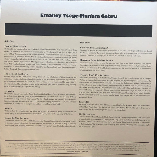 Tracklist: A1. Famine Disaster 1974, A2. The Home Of Beethoven, A3. Jerusalem, A4. Aurora, A5. Quand La Mer Furieuse, B1. Have You Seen Assayehegn?, B2. Movement From Rainbow Sonata, B3. Woigaye, Don't Cry Anymore, B4. Farewell Eve, B5. The Pilgrim Song