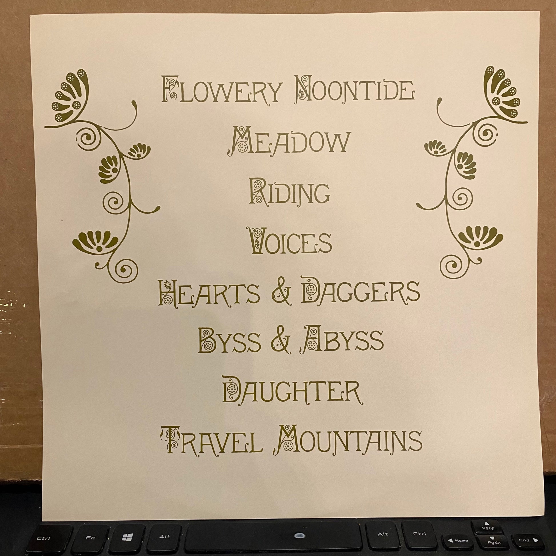 Tracklist: A1. Flowery Noontide, A2. Meadow, A3. Riding, A4. Voices, B1. Hearts & Daggers, B2. Byss & Abyss, B3. Daughter, B4. Travel Mountains