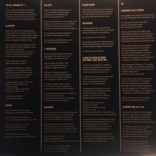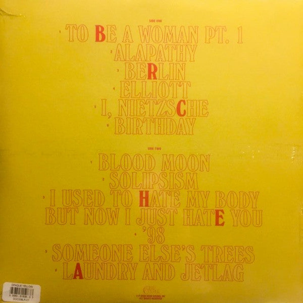 Tracklist: A1. To Be A Woman Pt. 1, A2. Alapathy, A3. Berlin, A4. Elliott, A5. I, Nietzsche, A6. Birthday, B1. Blood Moon, B2. Solipsism , B3. I Used To Hate My Body But Now I Just Hate You, B4. '98, B5. Someone Else's Trees, B6. Laundry And Jetlag
