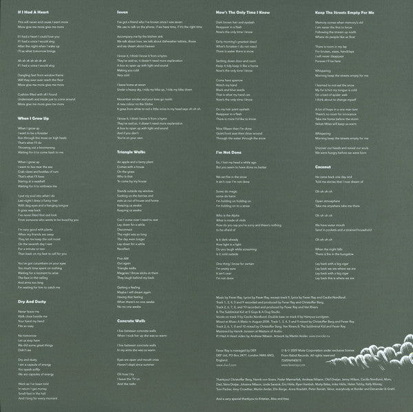 Tracklist: A1. If I Had A Heart, A2. When I Grow Up, A3. Dry And Dusty, A4. Seven, A5. Triangle Walks, B1. Concrete Walls, B2. Now's The Only Time I Know, B3. I'm Not Done, B4. Keep The Streets Empty For Me, B5. Coconut