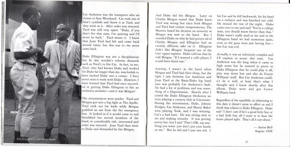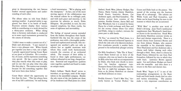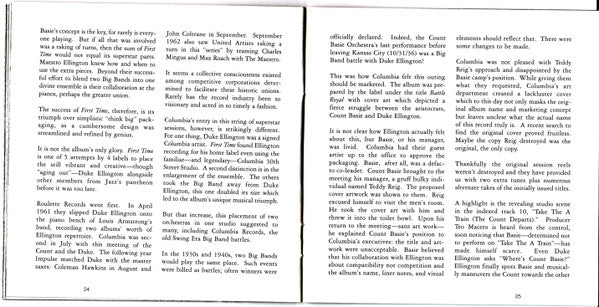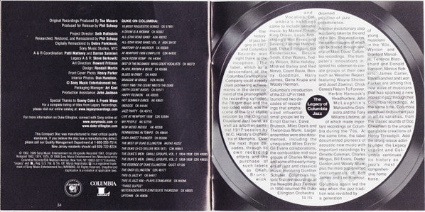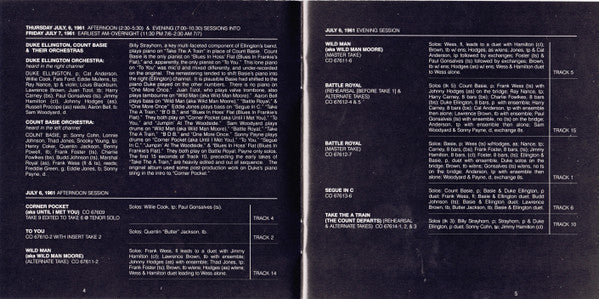"Tracks 1-8 made up the original album, Columbia CL 1715 (Mono)/CS 8515 (Stereo), released in 1962. Tracks 3 & 7 were shortened on the original stereo issue. They are issued here in stereo but at full length as on the original mono release. Track 9 was previously released--in pseudo-stereo--first appearing in 1972 on The World Of Swing, Columbia KG-32945. Track 13 was previously released, first appearing on Black Giants, Columbia PG-33402. The ending was faded out on previous issues. Tracks 10-12, and 14 & 15 are issued for the first time. Tracks 10, 15, & 16 are indexed." [booklet]