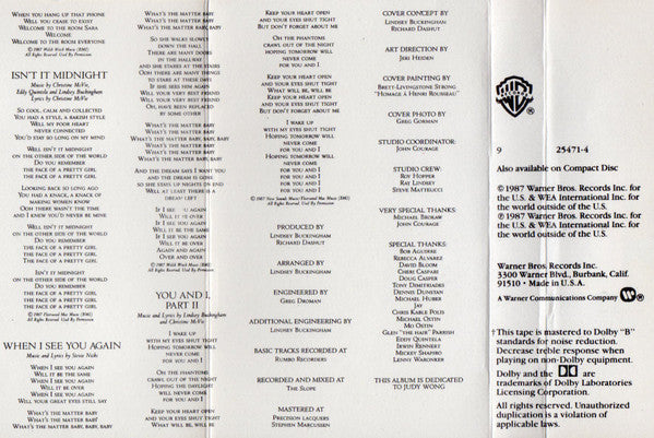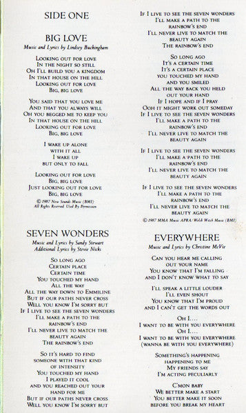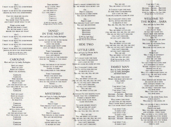 Tracklist: A1. Big Love, A2. Seven Wonders, A3. Everywhere, A4. Caroline, A5. Tango In The Night, A6. Mystified, B1. Little Lies, B2. Family Man, B3. Welcome To The Room...Sara, B4. Isn't It Midnight, B5. When I See You Again, B6. You And I, Part II