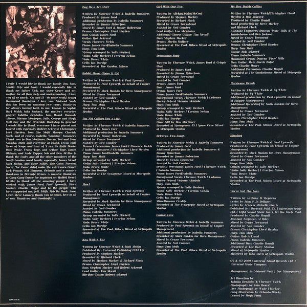 Tracklist: . -In-, A1. Dog Days Are Over, A2. Rabbit Heart (Raise It Up), A3. I'm Not Calling You A Liar, A4. Howl, A5. Kiss With A Fist, A6. Girl With One Eye, . -Out-, B1. Drumming Song, B2. Between Two Lungs, B3. Cosmic Love, B4. My Boy Builds Coffins, B5. Hurricane Drunk, B6. Blinding, B7. You've Got The Love