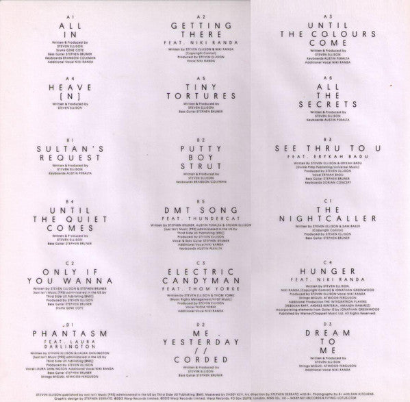 Tracklist: A1. All In, A2. Getting There, A3. Until The Colours Come, A4. Heave[n], A5. Tiny Tortures, A6. All The Secrets, B1. Sultan's Request, B2. Putty Boy Strout, B3. See Thru To U, B4. Until The Quiet Comes, B5. DMT Song, C1. The Nightcaller, C2. Only If You Wanna, C3. Electric Candyman, C4. Hunger, D1. Phantasm, D2. Me Yesterday//Corded, D3. Dream To Me