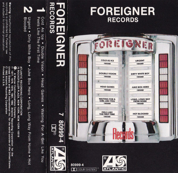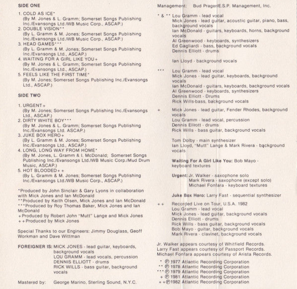 Tracklist: A1. Cold As Ice, A2. Double Vision, A3. Head Games, A4. Waiting For A Girl Like You, A5. Feels Like The First Time, B1. Urgent, B2. Dirty White Boy, B3. Juke Box Hero, B4. Long, Long Way From Home, B5. Hot Blooded