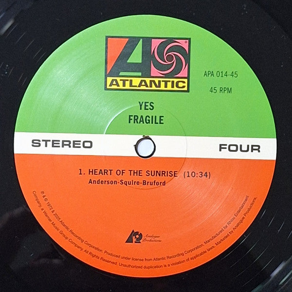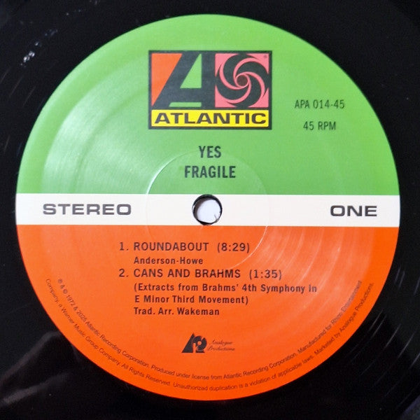 Tracklist: A1. Roundabout, A2. Cans And Brahms (Extracts From Brahms' 4th Symphony In E Minor Third Movement), B1. We Have Heaven, B2. South Side Of The Sky, C1. Five Per Cent For Nothing, C2. Long Distance Runaround, C3. The Fish (Schindleria Praematurus), C4. Mood For A Day, D1. Heart Of The Sunrise