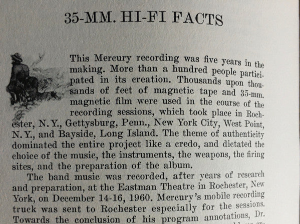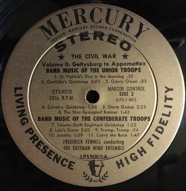 Tracklist: A1. Introduction, A2. Twinkling Stars Quickstep, A3. Old Kentucky, Kentucky, A4. Cape May Polka, A5. Rachel Waltzes, A6. Come Where My Love Lies Dreaming, A7. Un Ballo In Maschera Quickstep, B1. St. Patrick's Day in the Morning, B2. Grafulla's Quickstep, B3. Garry Owen, B4. Cavalry Quickstep, B5. Storm Gallup, B6. The Star Spangled Banner, B7. Twenty Sixth Regiment Quickstep, B8. Lulu's Gone, B9. Tramp, Tramp, B10. Juanita, B11. Carry Me Back, C1. Bugle Signals For The Service Of Skirmishers, C2. Drum Calls, C3. Camp And Field Duty Calls For Fifes And Drums, C4. The Appomattox Bugle, C5. We Are Coming Father Ab'ram, C6. Tenting Tonight On The Old Camp Ground, C7. Goober Peas, C8. Tramp, Tramp, Tramp, C9. Marching Through Georgia, C10. When Johnny Comes Marching Home, C11. The Battle Hymn Of The Republic, D1. Firearms Of The Civil War, D2. From Gettysburg To Appomattox