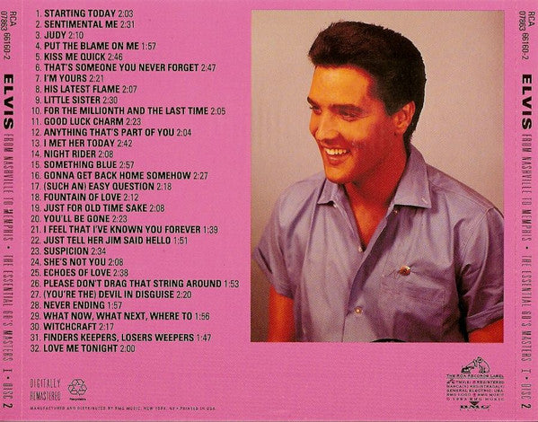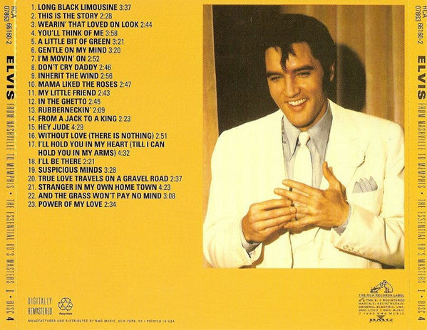 Tracklist: 1-01. Make Me Know It, 1-02. Soldier Boy, 1-03. Stuck On You, 1-04. Fame And Fortune, 1-05. A Mess Of Blues, 1-06. It Feels So Right, 1-07. Fever, 1-08. Like A Baby, 1-09. It's Now Or Never, 1-10. The Girl Of My Best Friend, 1-11. Dirty, Dirty Feeling, 1-12. Thrill Of Your Love, 1-13. I Gotta Know, 1-14. Such A Night, 1-15. Are You Lonesome Tonight?, 1-16. Girl Next Door Went A'Walking, 1-17. I Will Be Home Again, 1-18. Reconsider Baby, 1-19. Surrender, 1-20. I'm Comin' Home, 1-21. Gently, 1-22. In Your Arms, 1-23. Give Me The Right, 1-24. I Feel So Bad, 1-25. It's A Sin, 1-26. I Want You With Me, 1-27. There's Always Me, 2-01. Starting Today, 2-02. Sentimental Me, 2-03. Judy, 2-04. Put The Blame On Me, 2-05. Kiss Me Quick, 2-06. That's Someone You Never Forget, 2-07. I'm Yours, 2-08. His Latest Flame, 2-09. Little Sister, 2-10. For The Millionth And The Last Time, 2-11. Good Luck Charm, 2-12. Anything That's Part Of You, 2-13. I Met Her Today, 2-14. Night Rider, 2-15. Something Blue, 2-16. Gonna Get Back Home Somehow, 2-17. (Such An) Easy Question, 2-18. Fountain Of Love, 2-19. Just For Old Time Sake, 2-20. You'll Be Gone, 2-21. I Feel That I've Known You Forever, 2-22. Just Tell Her Jim Said Hello, 2-23. Suspicion, 2-24. She's Not You, 2-25. Echoes Of Love, 2-26. Please Don't Drag That String Around, 2-27. (You're The) Devil In Disguise, 2-28. Never Ending, 2-29. What Now, What Next, Where To, 2-30. Witchcraft, 2-31. Finders Keepers, Losers Weepers, 2-32. Love Me Tonight, 3-01. (It's A) Long Lonely Highway, 3-02. Western Union, 3-03. Slowly But Surely, 3-04. Blue River, 3-05. Memphis Tennessee, 3-06. Ask Me, 3-07. It Hurts Me, 3-08. Down In The Alley, 3-09. Tomorrow Is A Long Time, 3-10. Love Letters, 3-11. Beyond The Reef (Original Undubbed Master), 3-12. Come What May (Alternate Take 7), 3-13. Fools Fall In Love, 3-14. Indescribably Blue, 3-15. I'll Remember You (Original Unedited Master), 3-16. If Every Day Was Like Christmas, 3-17. Suppose (Master), 3-18. Guitar Man / What'd I Say (Original Unedited Master), 3-19. Big Boss Man, 3-20. Mine, 3-21. Just Call Me Lonesome, 3-22. Hi-Heel Sneakers (Original Unedited Master), 3-23. You Don't Know Me, 3-24. Singing Tree, 3-25. Too Much Monkey Business, 3-26. U.S. Male, 4-01. Long Black Limousine, 4-02. This Is The Story, 4-03. Wearin' That Loved On Look, 4-04. You'll Think Of Me, 4-05. A Little Bit Of Green, 4-06. Gentle On My Mind, 4-07. I'm Movin' On, 4-08. Don't Cry Daddy, 4-09. Inherit The Wind, 4-10. Mama Liked The Roses, 4-11. My Little Friend, 4-12. In The Ghetto, 4-13. Rubberneckin', 4-14. From A Jack To A King, 4-15. Hey Jude, 4-16. Without Love (There Is Nothing), 4-17. I'll Hold You In My Heart (Till I Can Hold You In My Arms), 4-18. I'll Be There, 4-19. Suspicious Minds, 4-20. True Love Travels On A Gravel Road, 4-21. Stranger In My Own Home Town, 4-22. And The Grass Won't Pay No Mind, 4:23. Power Of My Love, 5-01. After Loving You, 5-02. Do You Know Who I Am, 5-03. Kentucky Rain, 5-04. Only The Strong Survive, 5-05. It Keeps Right On A-Hurtin', 5-06. Any Day Now, 5-07. If I'm A Fool (For Loving You), 5-08. The Fair Is Moving On, 5-09. Who Am I?, 5-10. This Time / I Can't Stop Loving You (Informal Recording), 5-11. In The Ghetto (Alternate Take 4), 5-12. Suspicious Minds (Alternate Take 6), 5-13. Kentucky Rain (Alternate Take 9), 5-14. Big Boss Man (Alternate Take 2), 5-15. Down In The Alley (Alternate Take 1), 5-16. Memphis Tennessee (Alternate Take 1 From "The 1963 Session"), 5-17. I'm Yours (Alternate Take 1 Undubbed Version), 5-18. His Latest Flame (Alternate Take 4), 5-19. That's Someone You Never Forget (Alternate Take 1), 5-20. Surrender (Alternate Take 1), 5-21. It's Now Or Never (Original Undubbed Master), 5-22. Love Me Tender / Witchcraft (From "The Frank Sinatra Timex Special")