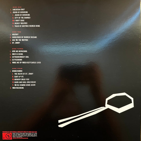 Tracklist: A1. American Idiot, . Jesus Of Suburbia, B1. Holiday, B2. Boulevard Of Broken Dreams, B3. Are We The Wating, B4. St. Jimmy, C1. Give Me Novacaine, C2. She's A Rebel, C3. Extraordinary Girl, C4. Letterbomb, C5. Wake Me Up When September Ends, . Homecoming, D2. Whatsername