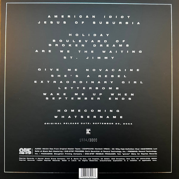 Because Sound Matters' meticulous One-Step process creates the definitive sounding audiophile version of Green Day's American Idiot. - This One-Step version is strictly limited to 3,000 copies. The album is housed inside a top quality, foil-stamped, uniquely designed numbered slipcase. The enclosed gatefold double LP will feature an "Old Style" double gatefold tip-on jacket with original artwork.
