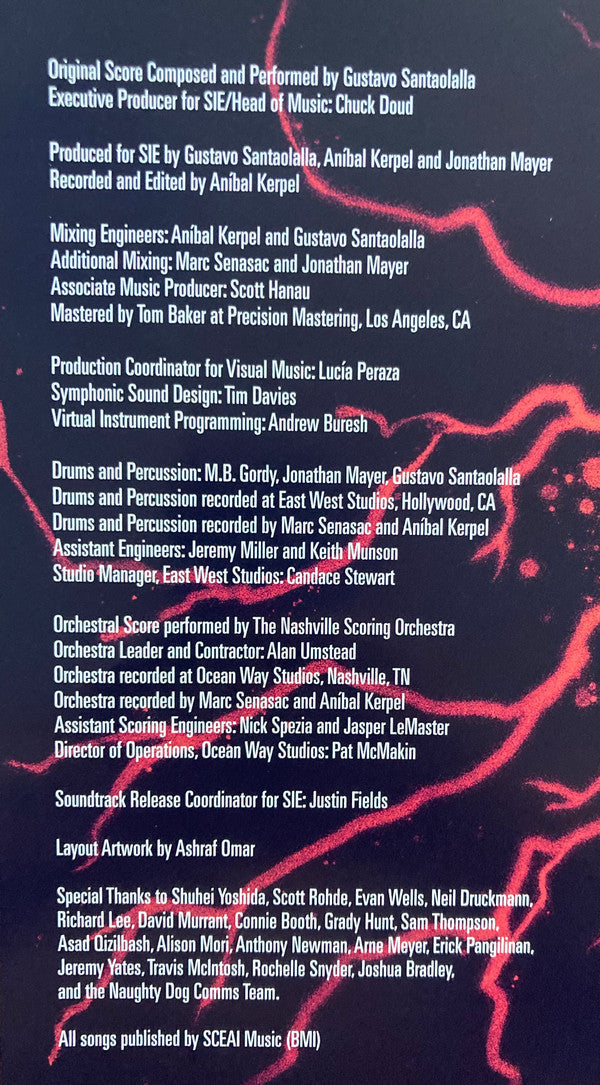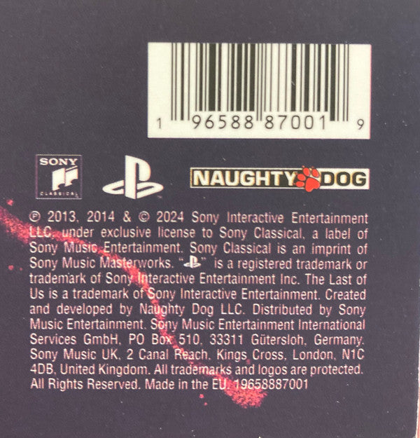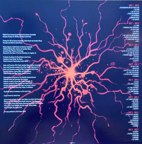 Tracklist: A1. The Quarantine Zone (20 Years Later), A2. The Hour, A3. The Last Of Us, A4. Forgotten Memories, A5. The Outbreak, A6. Vanishing Grace, A7. The Hunters, B1. All Gone, B2. Vanishing Grace (Innocence), B3. By Any Means, B4. The Choice, B5. Smugglers, B6. The Last Of Us (Never Again), B7. The Last of Us (Goodnight), B8. I Know What You Are, B9. Home, C1. Infected, C2. All Gone (Aftermath), C3. The Last of Us (A New Dawn), C4. All Gone (No Escape), C5. Vanishing Grace (Childhood), C6. The Path, C7. All Gone (Alone), C8. Blackout, D1. The Way It Was, D2. Breathless, D3. The Last Of Us (You And Me), D4. All Gone (The Outside), D5. The Path (A New Beginning), D6. Returning, E1. Fleeting, E2. All Gone (Seasons), E3. Evasion, E4. All Gone (Partners), E5. Cause And Effect, E6. All Gone (Reunion), E7. Stalking, F1. Left Behind (Together), F2. The Capitol, F3. Head Rush, F4. Wandering, F5. All Gone (Overcome), F6. Unstable, G1. The Last Of Us (Astray), G2. Answers, G3. Drawn In, G4. Apprehension, G5. The Path (Vacant), G6. Convergence, G7. Shadows, H1. No Mercy, H2. Fleeting (Affection), H3. Extinction, H4. Consumed, H5. Left Behind