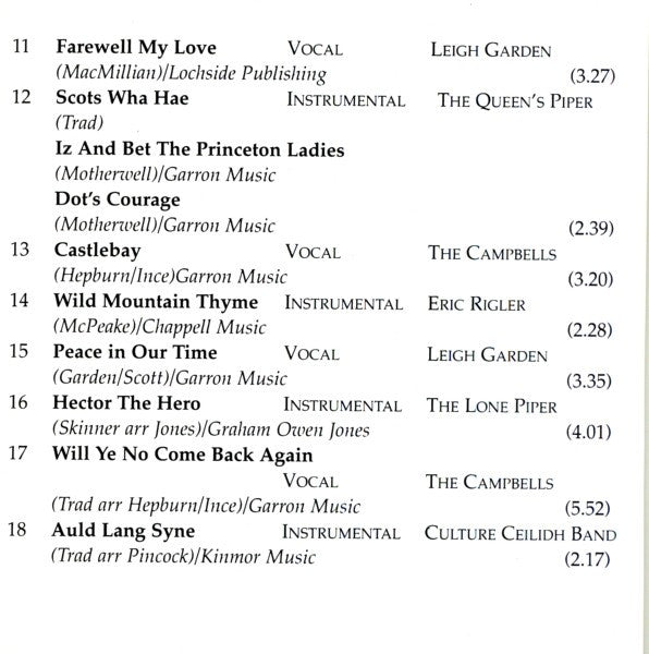 Tracklist: 1. Highland Cathedral, 2. Flower Of Scotland, 3. Leezie Lindsay, 4. The Dark Island, 5. The Ghosts Of Culloden, 6. Amazing Grace, 7. The Holy Loch, 8. Braveheart Trilogy, 9. The Strangest Dream, 10. Glencoe, 11. Farewell, My Love, 12. Scots Wha Hae, Iz And Bet The Princeton Ladies, Dot's Courage, 13. Castlebay, 14. Wild Mountain Thyme, 15. Peace In Our Time, 16. Hector The Hero, 17. Will Ye No Come Back Again, 18. Auld Lang Syne