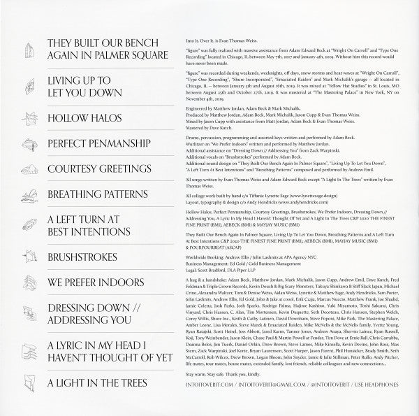 Tracklist: A1. They Built Our Bench Again In Palmer Square, A2. Living Up To Let You Down, A3. Hollow Halos, B1. Perfect Penmanship, B2. Courtesy Greetings, B3. Breathing Patterns, C1. A Left Turn At Best Intentions, C2. Brushstrokes, C3. We Prefer Indoors, D1. Dressing Down // Addressing You, D2. A Lyric In My Head I Haven't Thought Of Yet, D3. A Light In The Trees
