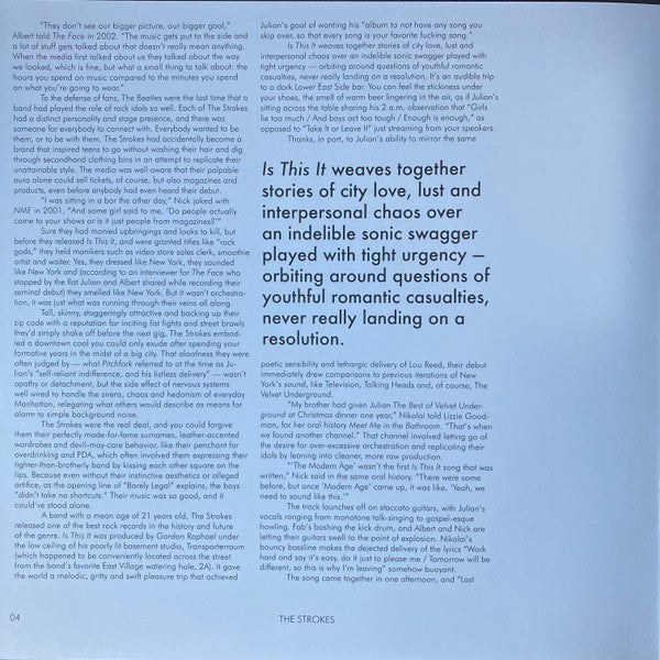 Tracklist: A1. Is This It, A2. The Modern Age, A3. Soma, A4. Barely Legal, A5. Someday, A6. Alone, Together, A7. Last Nite, B1. Hard To Explain, B2. New York City Cops, B3. When It Started, B4. Trying Your Luck, B5. Take It Or Leave It