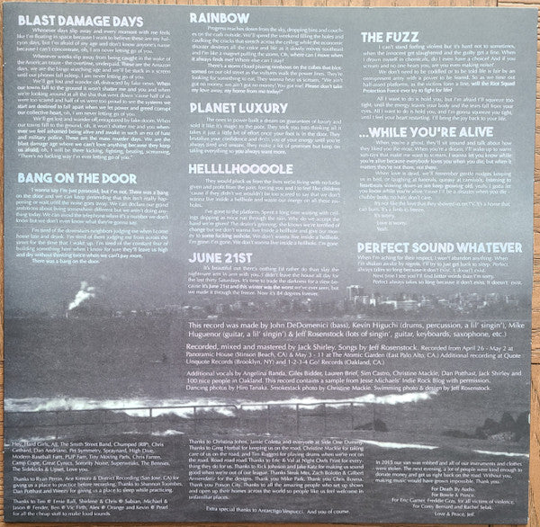 Tracklist: A1. We Begged 2 Explode, A2. Pash Rash, A3. Festival Song, A4. Staring Out The Window At Your Old Apartment, A5. Wave Goodnight To Me, A6. To Be A Ghost..., B1. Pietro, 60 Years Old, B2. I Did Something Weird Last Night, B3. Blast Damage Days, B4. Bang On The Door, B5. Rainbow, B6. Planet Luxury, B7. Helllhoooole, B8. June 21st, B9. The Fuzz, B10. ...While You're Alive, B11. Perfect Sound Whatever