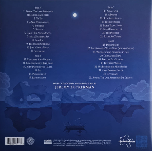 Tracklist: A1. Avatar: The Last Airbender (Premiere Main Title), A2. Yip Yip, A3. A Way With Animals, A4. Banished, A5. Katara, A6. Aang (The Avatar State), A7. Into A Nighttime Sky, A8. Agni Kai, A9. The Kyoshi Warriors, A10. Just A Simple Monk, A11. Superslide, B1. Remember Your Courage, B2. Into Fire Nation Territory, B3. Roku Destroys The Temple, B4. Jet, B5. Previously On, B6. Running Away, C1. Zuko's Scar, C2. A Dream, C3. Blue Spirit Rescue, C4. The Blue Spirit, C5. Iroh's Tsungi Horn, C6. Jun (Underbelly), C7. The Deserter, C8. To The Air Temple, D26. Descendents, D1. The Northern Water Tribe (Yue And Sokka), D2. Winter, Spring, Summer And Fall, D3. Commander Zhao, D4. Koh The Face Stealer, D5. The Spirit World, D6. Yue Becomes The Moon Spirit, D7. Aang Becomes Ocean, D8. Aftermath, D9. Avatar: The Last Airbender End Credits