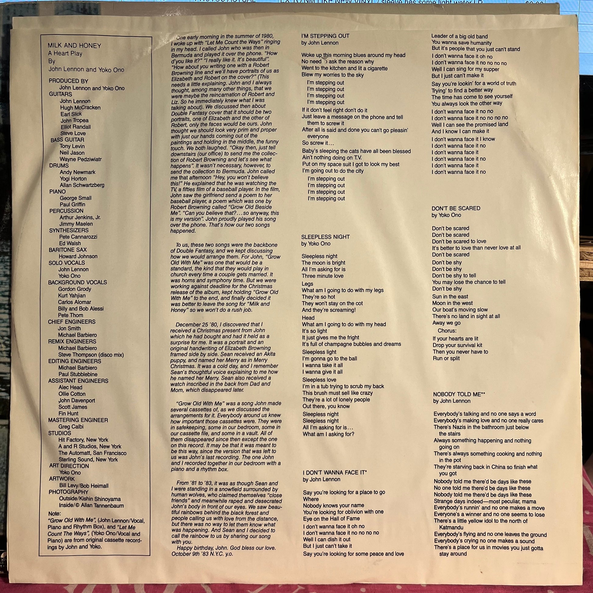 Tracklist: A1. I'm Stepping Out, A2. Sleepless Night, A3. I Don't Wanna Face It, A4. Don't Be Scared, A5. Nobody Told Me, A6. O'Sanity, B1. Borrowed Time, B2. Your Hands, B3. (Forgive Me) My Little Flower Princess, B4. Let Me Count The Ways, B5. Grow Old With Me, B6. You're The One
