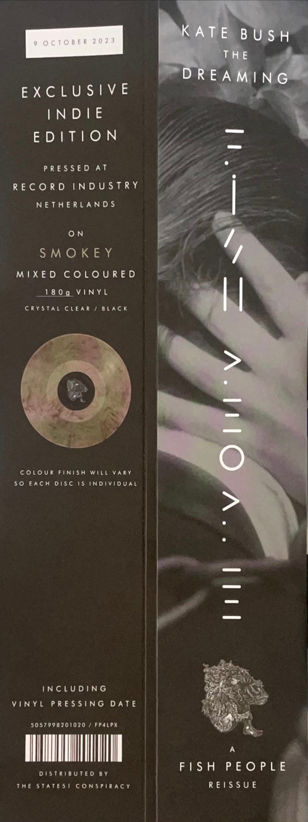 Kate Bush & Fish people records are proud and excited to announce new pressings of all 10 of Kate Bush's albums "It's very exciting to see people appreciating the physical presence of an album released on vinyl. It's how it's always been for me, especially when I was a teenager. The whole buzz of the record store was part of the experience. Buying an album was an event. " Kate Bush. The records are all pressed on 180gm vinyl at the world-renowned Record Industry plant in the Netherlands. New lacquers were cut from the 2018 remasters by Bernie Grundman and overseen by mastering engineer James Guthrie. All designed by Kate and feature new Fish People label designs, stunning colour vinyl combinations and obi strips with pressing date. They are protected in resealable poly-bag liners with a 'Fish People Reissue' sticker, bottom right. The Dreaming is Kate's fourth studio album and was released in 1982. Following Kate's production assistance on Lionheart, and her co-production of Never For Ever with Jon Kelly, The Dreaming was the first album Kate produced on her own. The album peaked at no. 3 in the UK album chart and has been certified Silver by the British Phonographic Industry. 180gm Smokey brown vinyl vinyl. Spot varnish sleeve. Obi strip with pressing date. Resealable poly-sleeve with sticker