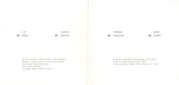 Tracklist: 1. Lit, 2. Held, 3. Looped, 4. Swayed, 5. Thrown, 6. Dragged, 7. Bent, 8. Burnt