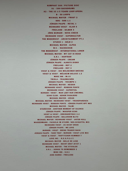 Tracklist: . Blue Disc, A1. Pure Vernunft Darf Niemals Siegen (Superpitcher / Wassermann Mix), A2. Everlasting, A3. Paris Is For Lovers (My Love), A4. Timecode, A5. I Think About You, B6. Neo, B7. Everybody’s Kissing Everyone, B8. Lovestoned , B9. Mushroom, B10. Prototype, . Green Disc, A1. Blond 1, A2. Over The Ice, A3. Calma Calma, A4. Unknown (Dixon Mix), A5. Circles, B6. Pop 1, B7. AG Penthouse (2. Epoche), B8. Making It Whistle, B9. All She Wants Is (Wighnomy Bros. Mix), B10. Reval 1, . Yellow Disc, A1. Pearly Spencer, A2. Berghain, A3. Augen Zu, A4. Superskunk, A5. Dicht Dran 1, B6. Brutalga Square, B7. Masterblaster, B8. Pride Is Weaker Than Love, B9. From The Crypt To The Astrofloor, B10. Forever Ravers, . Orange Disc, A1. Rosenkranz, A2. Stille Hände, A3. The Bionaut, A4. W.I.R. (Sven Väth Mix), A5. Coiling, B6. Slow, B7. Wurz + Blosse, B8. Unstable Condition, B9. I’m In Love With A German Film Star (Gui Boratto Mix), B10. So Weit Wie Noch Nie, . Pink Disc, A1. Walter Neff, A2. Tischlein Deck Dich, A3. Beautiful Life, A4. Goldfisch, A5. Rivals (DJ Hell Mix), B6. Maria, B7. Fackeln Im Sturm, B8. Take That, B9. Happiness (Michael Mayer Mix), B10. Regensburg, . Picture Disc, A1. 500 Bassdrums, A2. The 33 1/3 Years Loop-Opera, B. 50 Loops