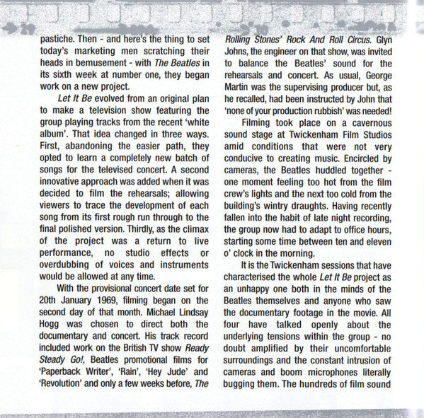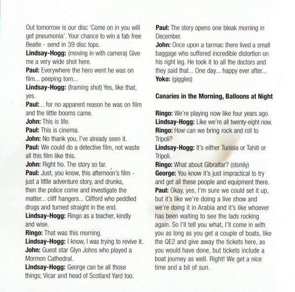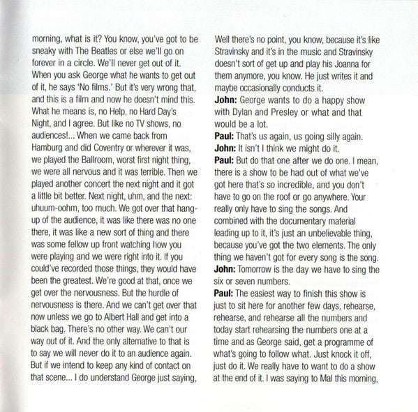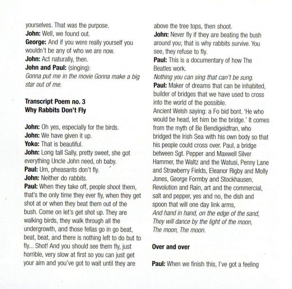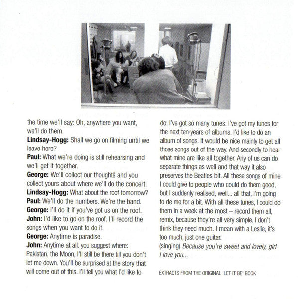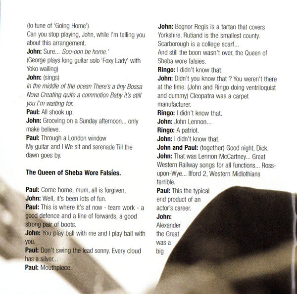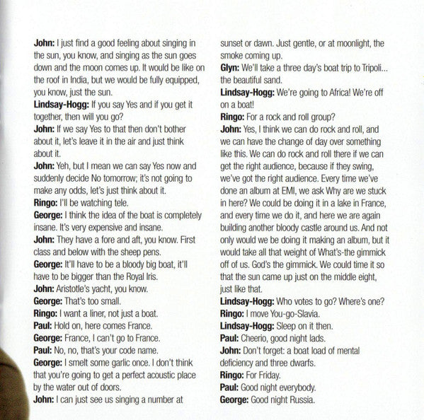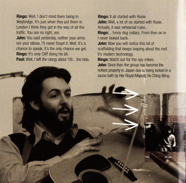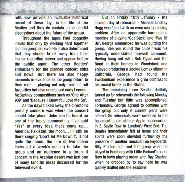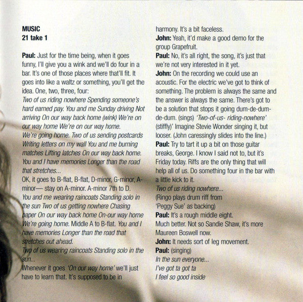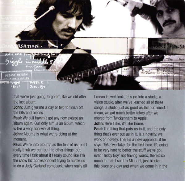 "Fly On The Wall" is a unique insight into the Beatles at work in rehearsal and in the studio during January 1969. It is one long track with a total time of 21:58. The subtitles and track duration times (duration timings for the conversations are not provided) as listed here appear in the booklet but the track itself is not indexed. The information was compiled and edited by Kevin Howlett. Technical assistance: Brian Thompson.