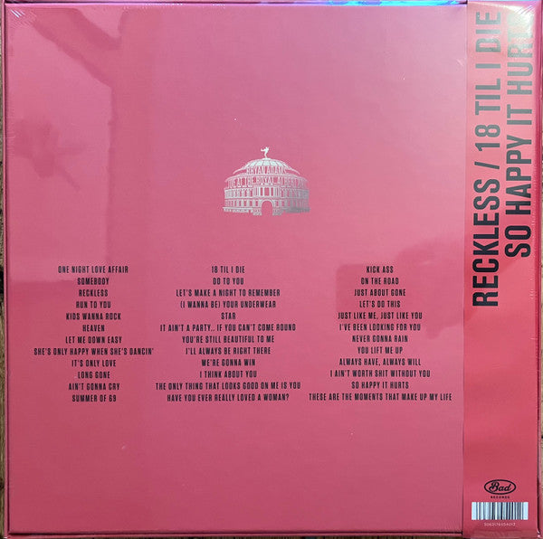 Tracklist: . Reckless (Live At The Royal Albert Hall 2024), A1. One Night Love Affair (Reckless 40th Anniversary), A2. Somebody (Reckless 40th Anniversary), A3. Reckless (Reckless 40th Anniversary), A4. Run To You (Reckless 40th Anniversary), B1. Kids Wanna Rock (Reckless 40th Anniversary), B2. Heaven (Reckless 40th Anniversary), B3. Let Me Down Easy (Reckless 40th Anniversary), B4. She's Only Happy When She's Dancin' (Reckless 40th Anniversary), C1. It's Only Love (Reckless 40th Anniversary), C2. Long Gone (Reckless 40th Anniversary), C3. Ain't Gonna Cry (Reckless 40th Anniversary), C4. Summer Of 69 (Reckless 40th Anniversary), . 18 Til I Die (Live At The Royal Albert Hall 2024), E1. 18 Til I Die (18 Til I Die), E2. Do To You (18 Til I Die), E3. Let's Make A Night To Remember (18 Til I Die), E4. (I Wanna Be) Your Underwear (18 Til I Die), E5. Star (18 Til I Die), E6. It Ain't A Party - If You Can't Come 'Round (18 Til I Die), F1. You're Still Beautiful To Me (18 Til I Die), F2. I'll Always Be Right There (18 Til I Die), F3. We're Gonna Win (18 Til I Die), F4. I Think About You (18 Til I Die), F5. The Only Thing That Looks Good On Me Is You (18 Til I Die), F6. Have You Ever Really Loved A Woman? (18 Til I Die), . So Happy It Hurts (Live At The Royal Albert Hall 2024), G1. Kick Ass (So Happy It Hurts), G2. On The Road (So Happy It Hurts), G3. Just About Gone (So Happy It Hurts), G4. Let's Do This (So Happy It Hurts), G5. Just Like Me, Just Like You (So Happy It Hurts), G6. I've Been Looking For You (So Happy It Hurts), G7. Never Gonna Rain (So Happy It Hurts), H1. You Lift Me Up (So Happy It Hurts), H2. Always Have, Always Will (So Happy It Hurts), H3. I Ain't Worth Shit Without You (So Happy It Hurts, H4. So Happy It Hurts (So Happy It Hurts), H5. These Are The Moments That Make Up My Life (So Happy It Hurts), . Live At The Royal Albert Hall 2024, BD. Reckless / 18 Til I Die / So Happy It Hurts