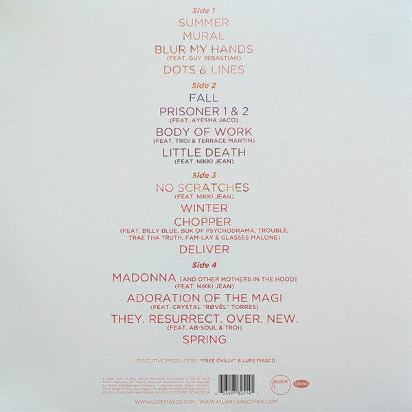 Tracklist: A1. Summer, A2. Mural, A3. Blur My Hands, A4. Dots & Lines, B1. Fall, B2. Prisoner 1 & 2, B3. Body of Work, B4. Little Death, C1. No Scratches, C2. Winter, C3. Chopper, C4. Deliver, D1. Madonna (And Other Mothers in The Hood), D2. Adoration of the Magi, D3. They.Resurrect.Over.New., D4. Spring