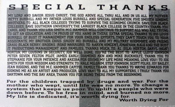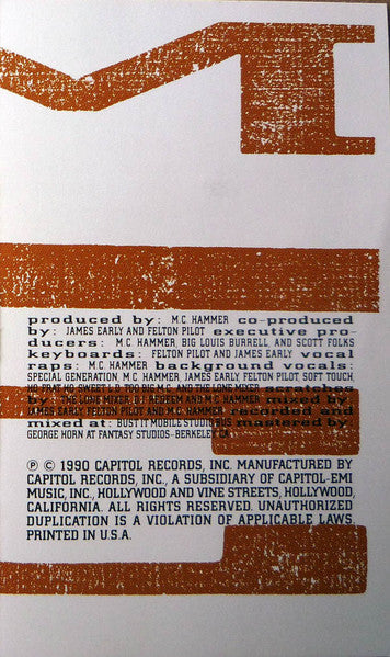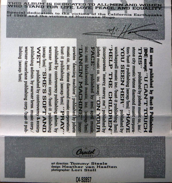 Tracklist: A1. Here Comes The Hammer, A2. U Can't Touch This, A3. Have You Seen Her, A4. Yo!! Sweetness, A5. Help The Children, A6. On Your Face, B1. Dancin' Machine, B2. Pray, B3. Crime Story, B4. She's Soft And Wet, B5. Black Is Black, B6. Let's Go Deeper, B7. Work This